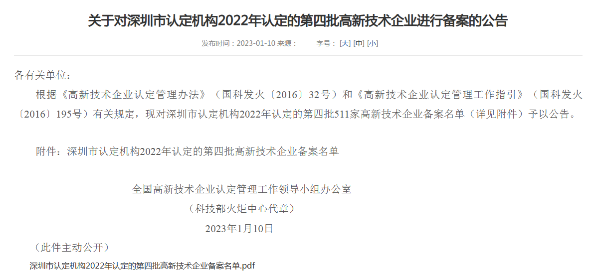 在2022年12月19日科技部火炬中心宣布的《深圳市认定机构2022年认定的第四批高新手艺企业备案公示名单》中,,,,,新金宝集团经天下高新手艺企业认定治理事情向导小组办公室评定审查,,,,,最终被认定为国家高新手艺企业。。。。。